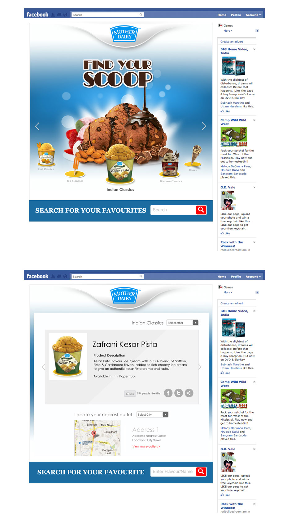 FIND YOUR SCOOP (BASICALLY AN INTERACTIVE MENU) Users can view the tentire range of products. User can finetune his search by > Flavour > Bricks/Cones/Popsicles/Tubs > Western/Indian/Classic User can share the result with his friend (i..e Social Share).